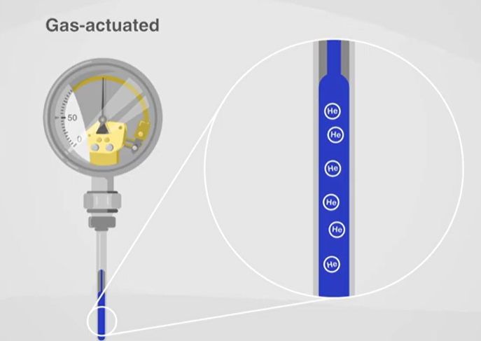 Gas expansion thermometers, also known as gas-actuated thermometers, use the principle of gas expansion to measure temperature. Helium (He) is generally recommended. When the temperature rises, the gas in the thermometer will expand, changing the pressure in the tube. This pressure drives the pointer.