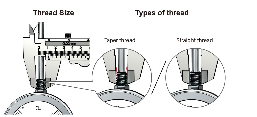Threads can be categorized as straight (parallel threads) or tapered (tapered threads). Standard specifications for thermometer connections in European countries and industrial applications are often referred to as British Standard Pipe (BSP). In contrast, in North American countries, the American National Pipe Thread (NPT) is more commonly used.