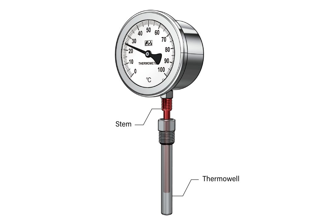To achieve optimal temperature measurement efficiency and accuracy, it is recommended that the stem of a dial thermometer be fully immersed in the process medium or at least inserted to a depth ranging from one to two thirds of the stem length. Stems have a minimum length of 50 mm.