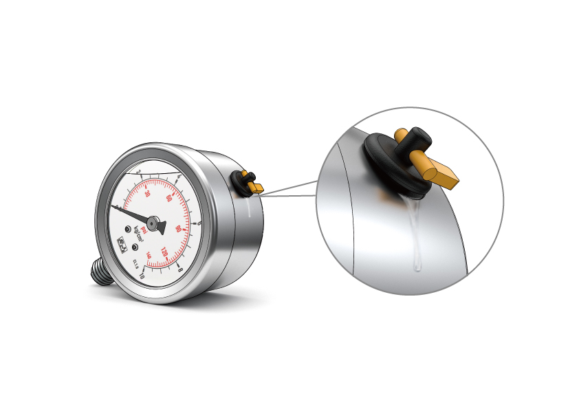 - The pressure gauge oil plug was damaged (loss of elasticity, damage, etc.), resulting in liquid leakage. You need to replace the damaged plug and install a new one.