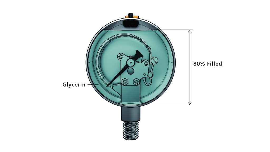 Liquid-filled pressure gauges, also known as shock-resistant pressure gauges, are injected with liquid between the pressure gauge case and the components. This lubricates the components so that they are not easily worn, extending the life of the pressure gauge. It can reduce negative effects on the pointer when the pressure change amplitude is large, reduce fluctuations and reduce the impact of vibration on the reading. A liquid-filled pressure gauge is suitable for the use of machinery with large vibration, such as: plastic injection molding machines, compressor machines, and other types of machinery.